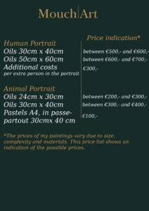 The prices of my paintings vary due to size, complexity and materials. The price list you see here shows an indication of the possible prices. We will discuss the price further when you contact me for the commission after the commissions open up again.