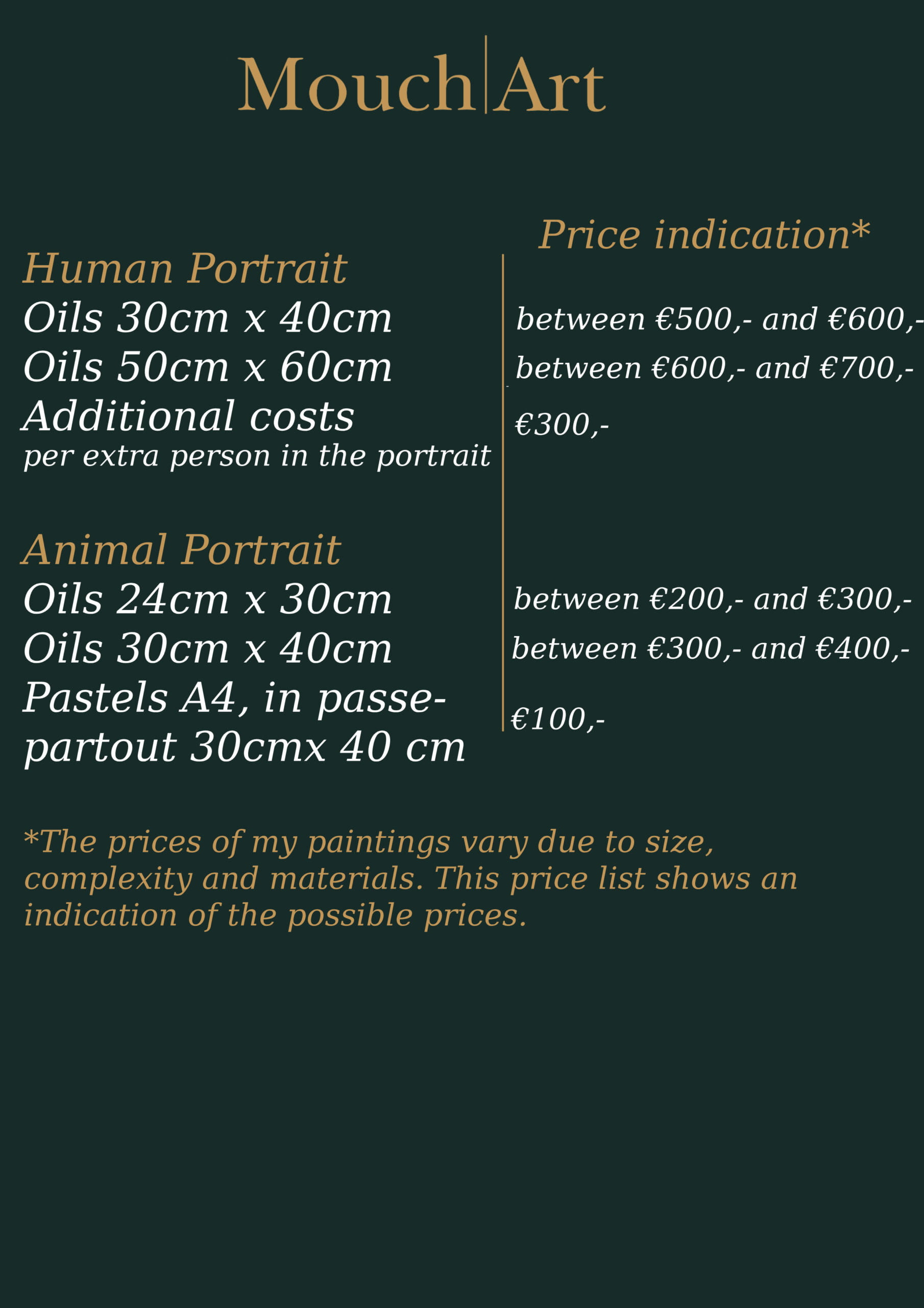 The prices of my paintings vary due to size, complexity and materials. The price list you see here shows an indication of the possible prices. We will discuss the price further when you contact me for the commission after the commissions open up again.